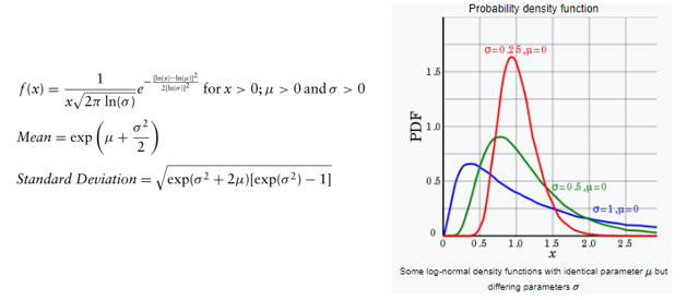 Lognormal distribution is a good candidate for modelling positively skewed values, which are ≥ 0. For instance, the normal distribution cannot be used to model stock prices because it has a negative side, and stock prices cannot fall below zero, so lognormal distribution is a good candidate. Thus, if a random variable X is log-normally distributed, then Y = ln(X) has a normal distribution. Likewise, if Y has a normal distribution, then the exponential function of Y, X = exp(Y), has a lognormal distribution. The lognormal distribution is described by 2 parameters, the mean and the standard deviation.