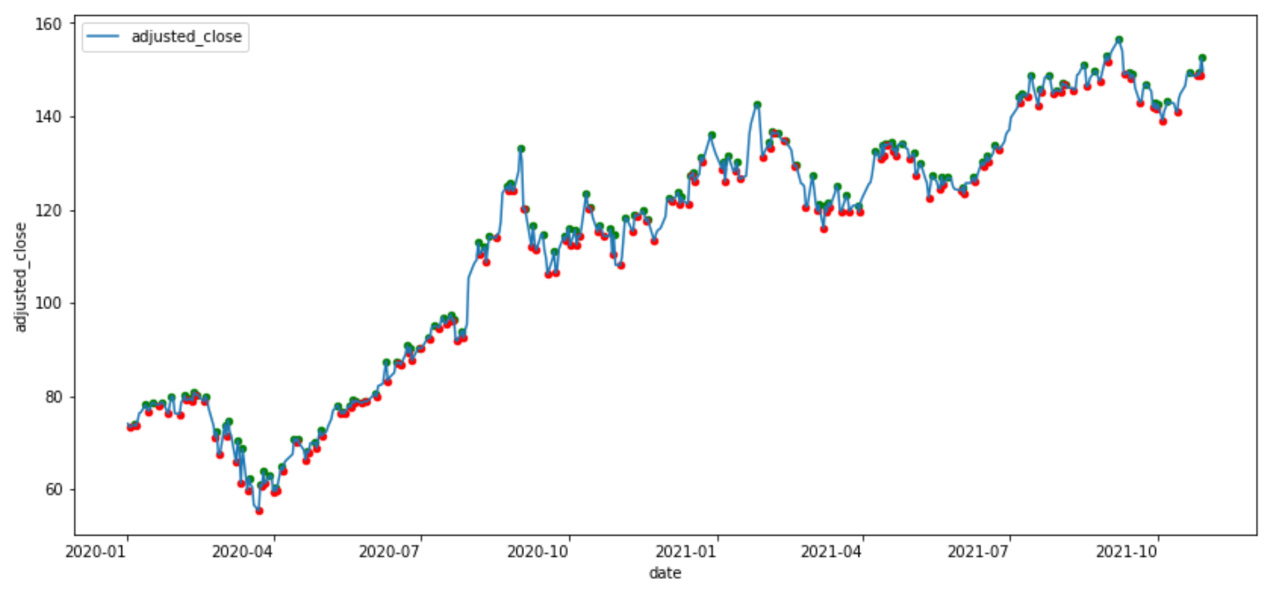 ax = df_sub.plot(x="date", y="adjusted_close", figsize=(14, 7))df_sub.iloc[peaks[0]].plot.scatter(x="date", y="adjusted_close", ax=ax, color="green")df_sub.iloc[troughs[0]].plot.scatter(x="date", y="adjusted_close", ax=ax, color="red")